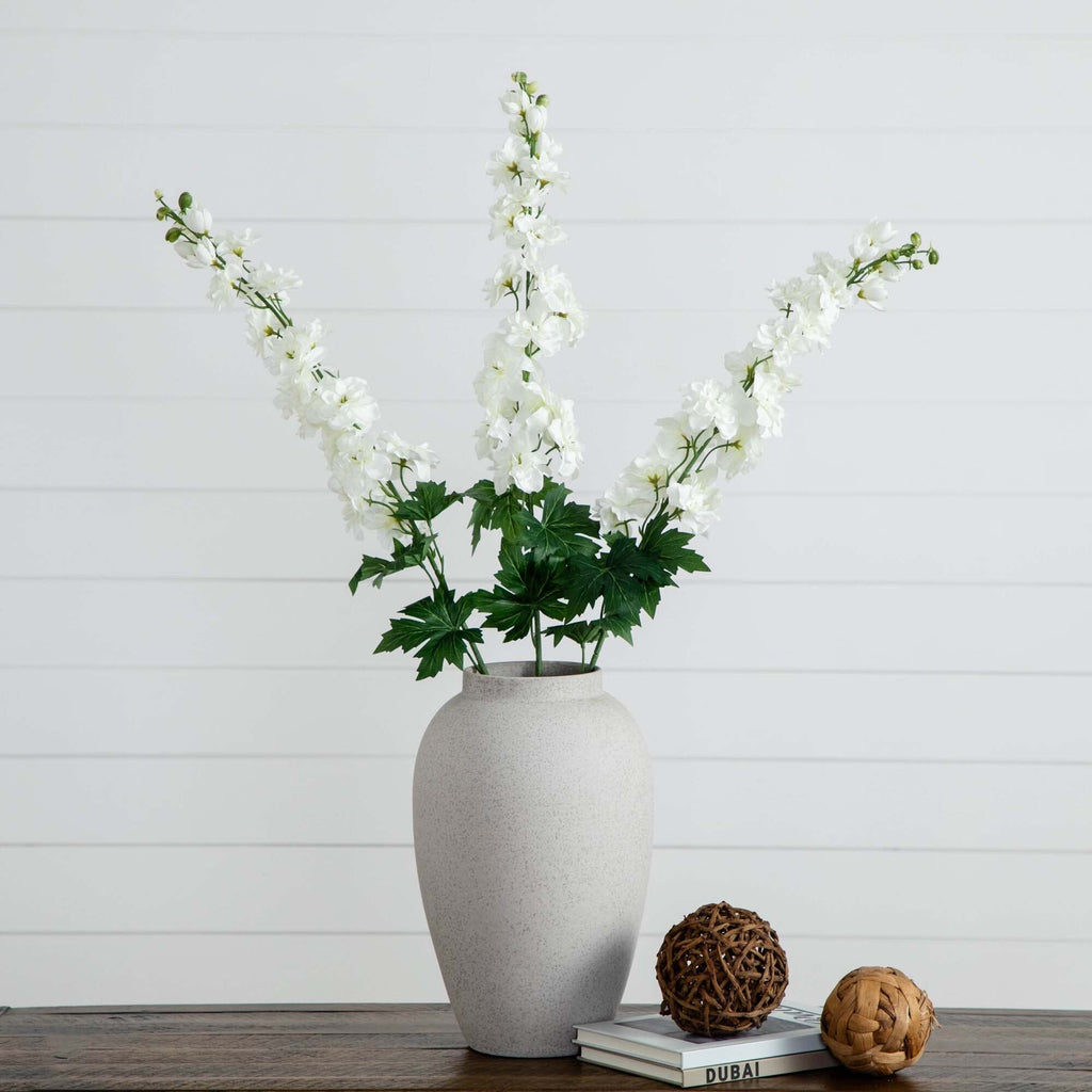 Delphinius are among the most breathtaking flowers in the world. Now, you have the chance to add them in your space with their elegance through our set of 3 artificial Delphinium -inspired flower stems. Feel the soft, pillow-like petals of these delicate blooms, complemented by dark green leaves for a touch of realism. Each stem is crafted from premium materials and features fully wired branches, enabling effortless shaping, bending, and trimming to create your ideal arrangement. At a striking 39in height, this set allows you to capture the majesty of Delphiniums right in your own space. Great for any desktop, business, office, or everyday use, feel free to style in any vase.