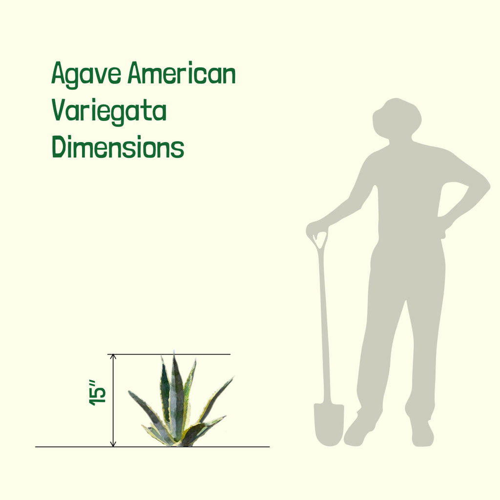 Large green and yellow variegated agave. Does off set at a moderate rate. Reliably cold hardy to nights in the mid twenties. Mature size of 5'x5' in the ground. Grows slower and to a smaller size when planted in a decorative pot.