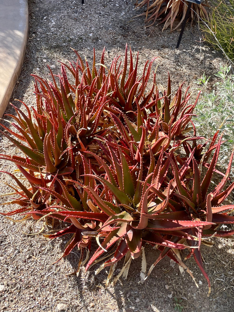 Striking Aloe with reddish leaves when stressed. Cold and lack of water being the stressors that bring on this gorgeous color. Orange flowers bloom on multiple flower stalks. Eventually grows up on a narrow trunk. Fun and interesting plant for a decorative pot or planted in a landscape in a suitable climate.