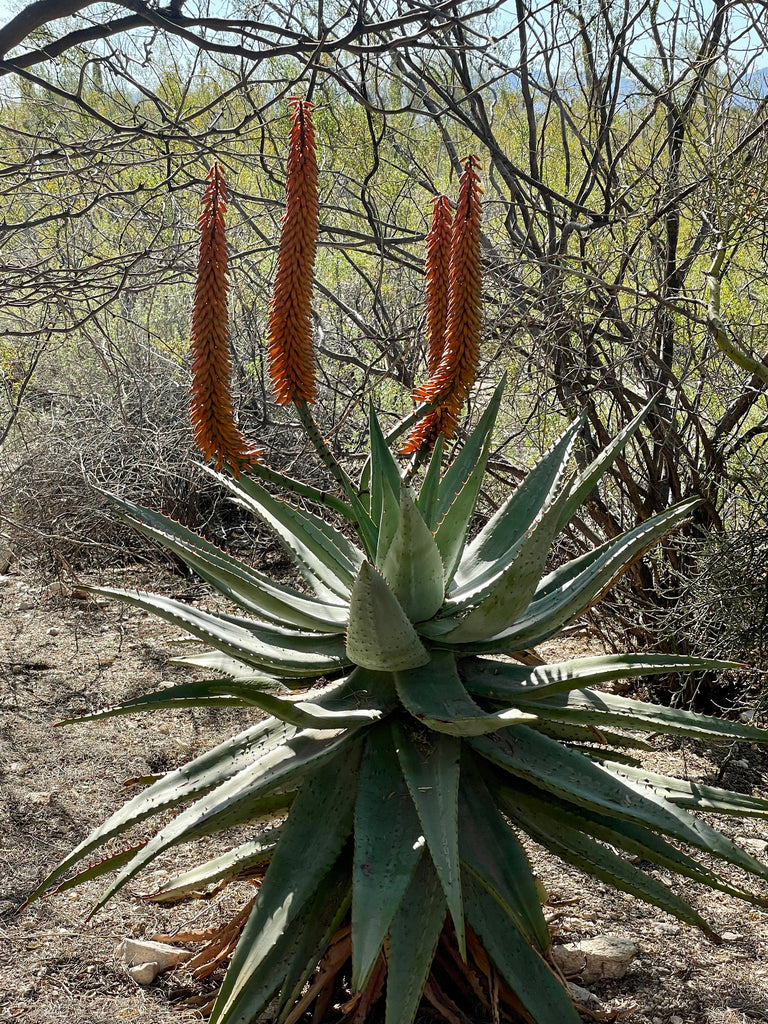 A tree aloe from South Africa. Can grow to 5' tall on a trunk. Magnificent candelabra flower stalk every year once the plant is mature.