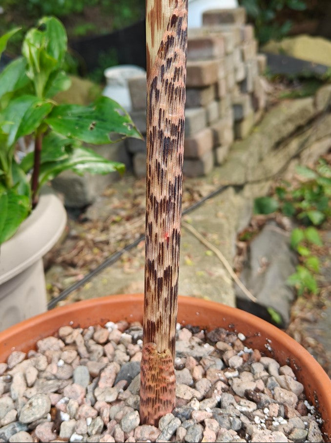 Here is a stunning deciduous Himalayan cobra lily that emerges in late winter to early spring. It carries its inflorescence on a tall thin mottled pseudostem about 12"-36" tall. The white, green, dark brown, and yellow -green inflorescences open before the pedate leaves. Striking spathes are brownish purple mottled with green and striped with distinctive white vertical lines. It grows from a tuberous rhizome in shaded woodland habitats, offsets freely and is usually very reliable to flower. It is resistant to deer and rabbits.