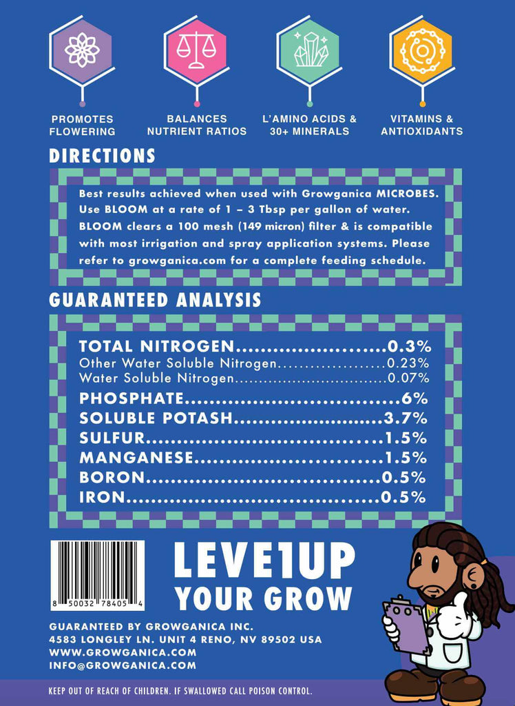 Growganica Bloom is an exceptional organic boom fertilizer designed to maximize the flowering and fruiting potential of your plants. With a balanced NPK ratio of 0.3-6-3.7, Bloom provides the perfect blend of nutrients to support vibrant blooms and bountiful harvests, ensuring your plants flourish during this critical stage. Bloom replaces traditional “Flowering A” and “Flowering B” nutrients into one single product.