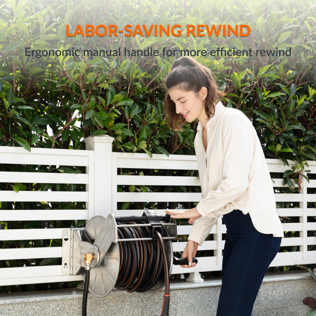 - Easy Winding: The ergonomic and labor-saving design crank handle and the hose guide help you manually wind the hose evenly around the reel with less mess.