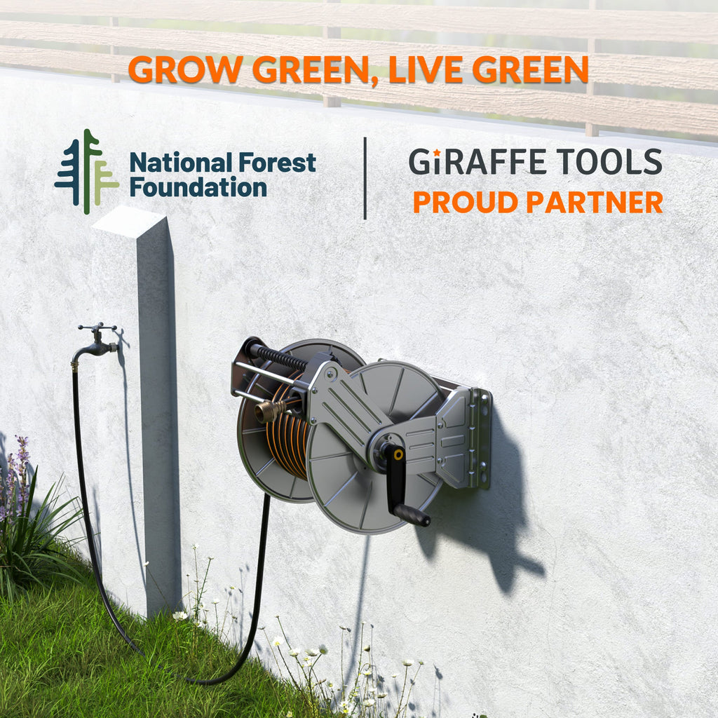 Giraffe Tools wall-mounted garden hose reel allows you to tuck a hose away easily when it's not in use. Make garden hose storage simple and clean!